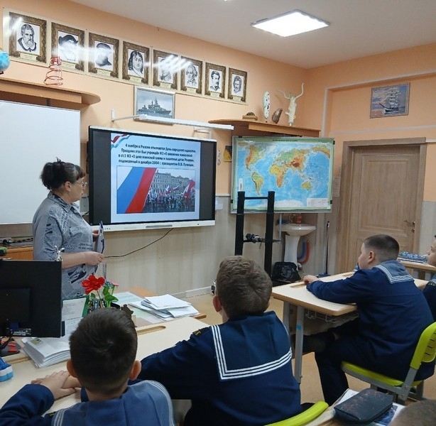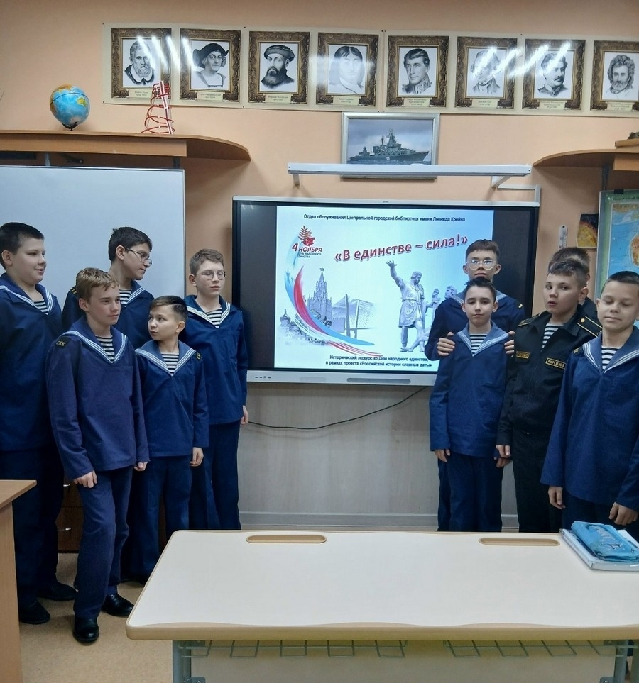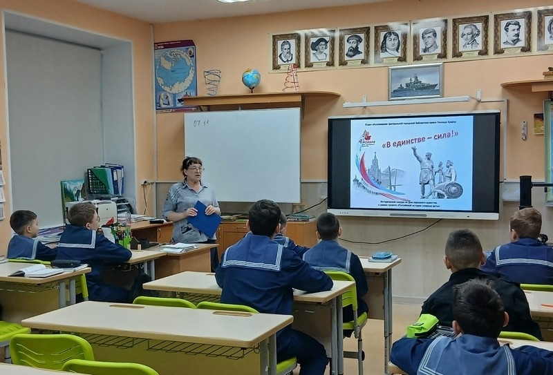7 ноября 2025 года кадеты старших классов Североморского кадетского корпуса в рамках проекта «Российской истории славные даты» совершили исторический экскурс «В единстве – сила!», посвященный Дню народного единства. Мероприятие провела Елена Каленистова, специалист отдела обслуживания Центральной городской библиотеки им. Л. Крейна.