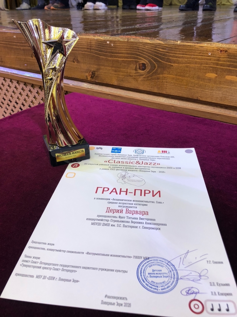 Триумфально завершилась поездка в г. Полярные Зори для учащихся Североморской ДМШ. Участие в VII открытом районном конкурсе исполнительского мастерства обучающихся ДМШ и ДШИ на народных и духовых инструментах «Classiс&Jazz» в рамках XXIII фестиваля искусств «Полярные Зори – 2026» пополнило копилку достижение новыми наградами: ГРАН-ПРИ, 9 дипломов лауреата I степени, 9 дипломов лауреата 2 и 6 дипломов лауреата 3 степени.