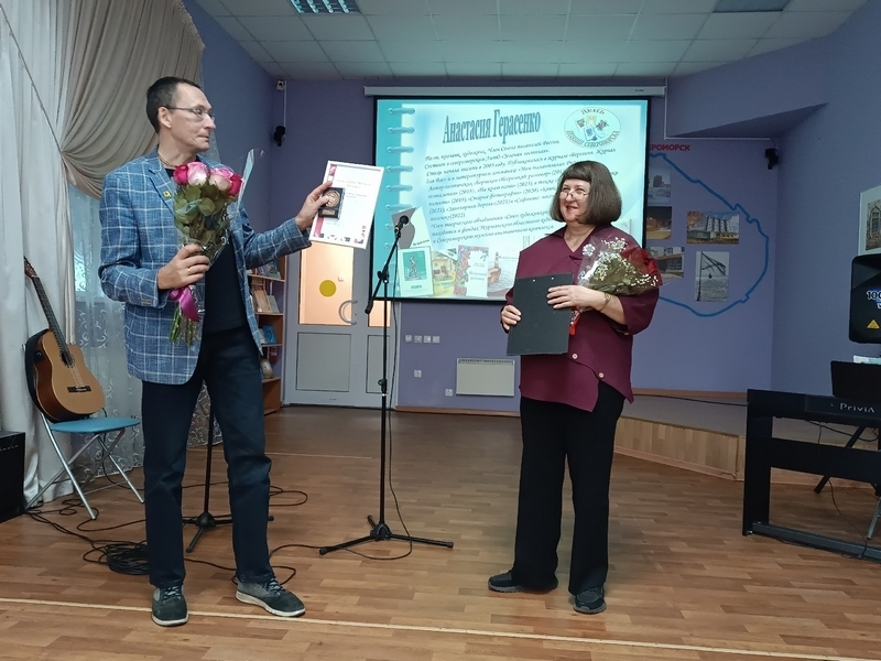 В адрес поэта и прозаика, члена Союза писателей России Анастасии Герасенко, которая присутствовала на празднике в свой юбилейный день рождения, прозвучало много тёплых поздравлений. Председатель Мурманского отделения Союза писателей России Илья Виноградов вручил Анастасии медаль «За верность и преданность библиотеке» от Мурманской государственной областной универсальной научной библиотеки.