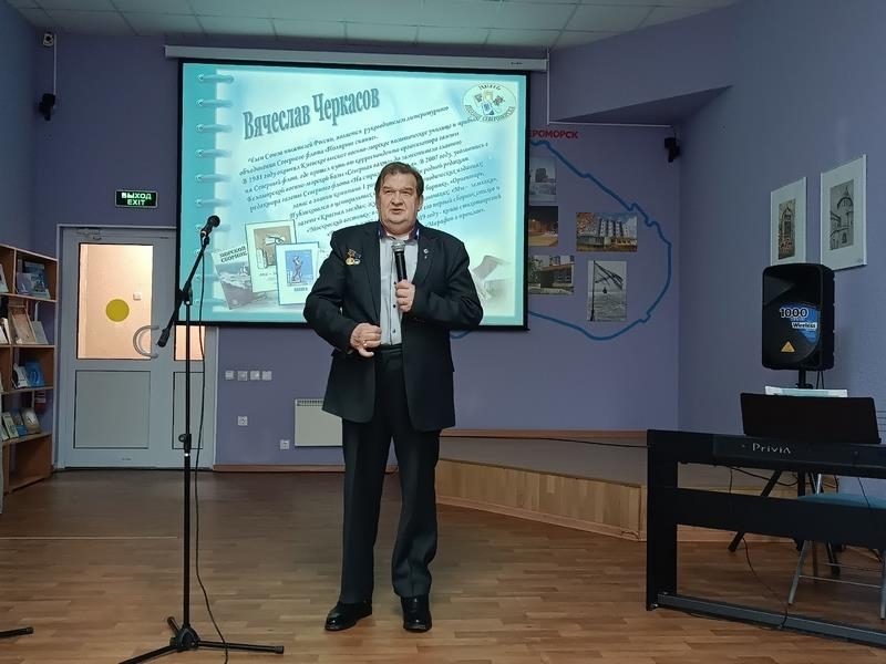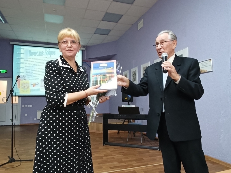 Вячеслав Яковлевич рассказал, что в этом году к 65-летию творческого объединения «Композиторы Заполярья» была издана его книга очерков под названием «В содружестве Муз», которую он любезно передал в библиотеку.