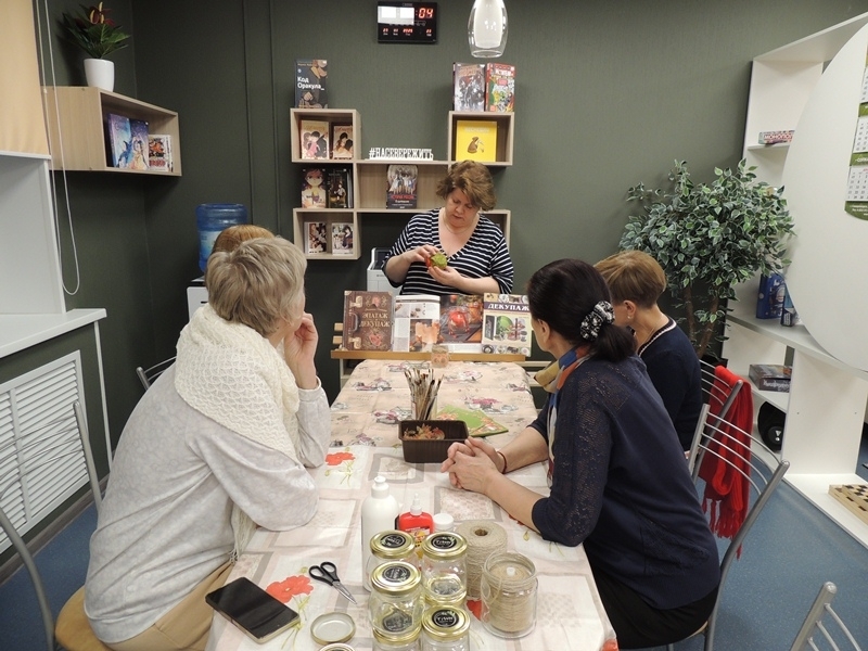 В ходе мероприятия  участники ознакомились с историей декупажа от появления в средневековом Китае до сегодняшних  дней, от украшения мебели до небольших предметов быта; разнообразием материалов для данного вида творчества; книгами о декупаже. И, наконец, рукодельницы «серебряного» возраста пробовали свои силы в технике прямого декупажа - создавали подсвечники  осенней тематики.