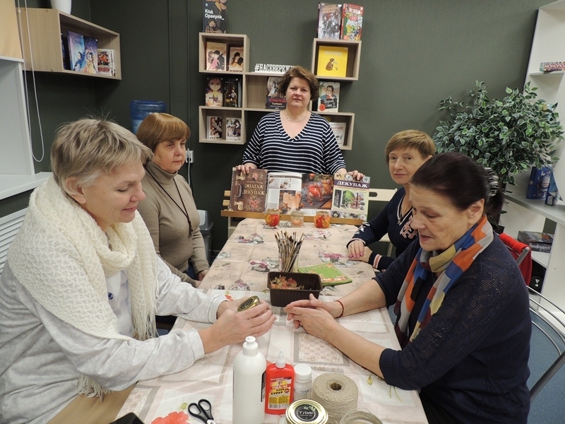Гости мероприятия Библиотекарь Екатерина Жигадло рассказывает об истории декупажа Работа начинается с выбора материалов Первые шаги в технике прямого декупажа У каждой рукодельницы свой темп работы Предмет декора своими руками готов!