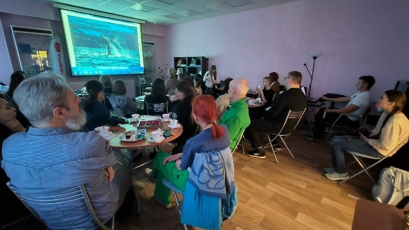 Антон Чайко продемонстрировал новые фотографии китов, тюленей, морских птиц и других обитателей Баренцева моря и прибрежных территорий, которых он поймал в объектив своей камеры в прошедшем сезоне. Гости встречи с большим интересом слушали рассказ Антона о встречах с морскими обитателями Баренцева моря, об опыте наблюдения за китами и внесения их в международную базу данных.