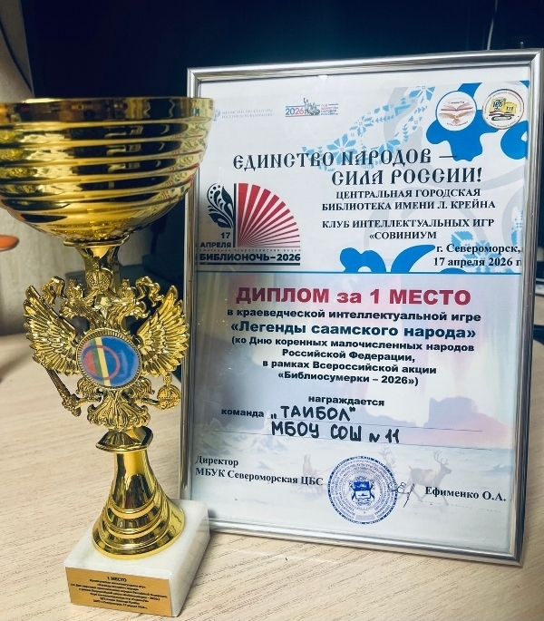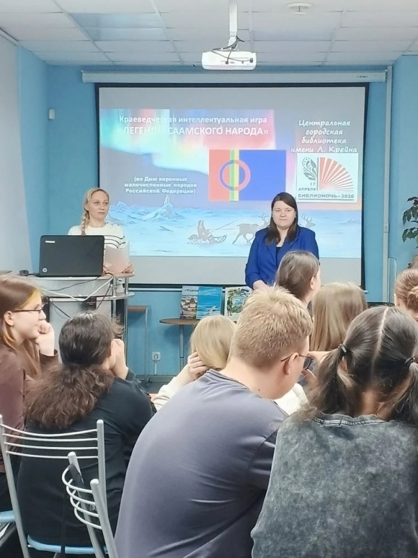 17 апреля 2026 года игровой сезон в клубе интеллектуальных игр "СовиниУм" Центральной городской библиотеки им. Л. Крейна завершился краеведческой интеллектуальной игрой «Легенды саамского народа», посвященной Дню коренных малочисленных народов Российской Федерации. Мероприятие состоялось в рамках Всероссийской социокультурной акции в поддержку чтения «Библиосумерки 2026».